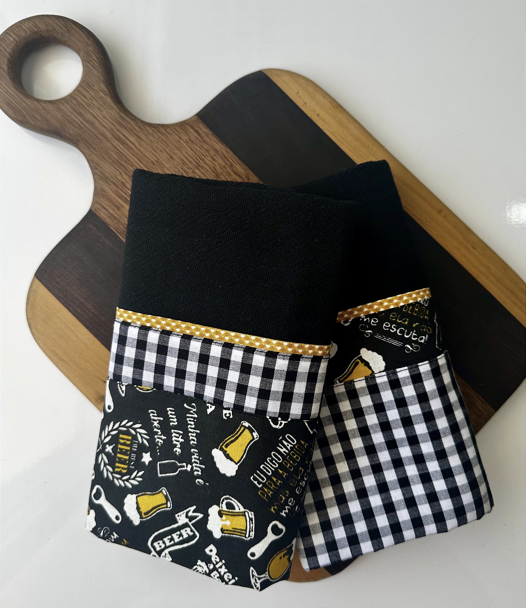 Jogo com 2 panos de prato PRETOS com barrado em tricoline. Ideal para churrasqueira e área gourmet.