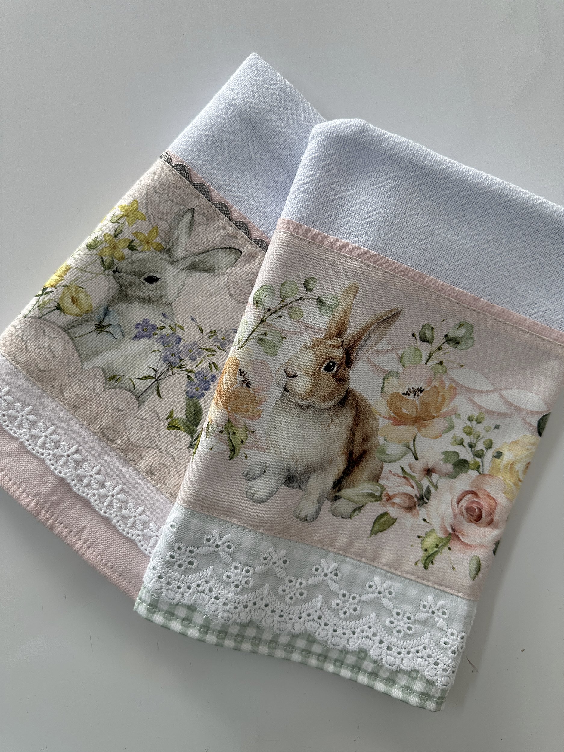 Conjunto com 2 panos de prato com barrado em tricoline e bordado inglês. Estampas digitais.