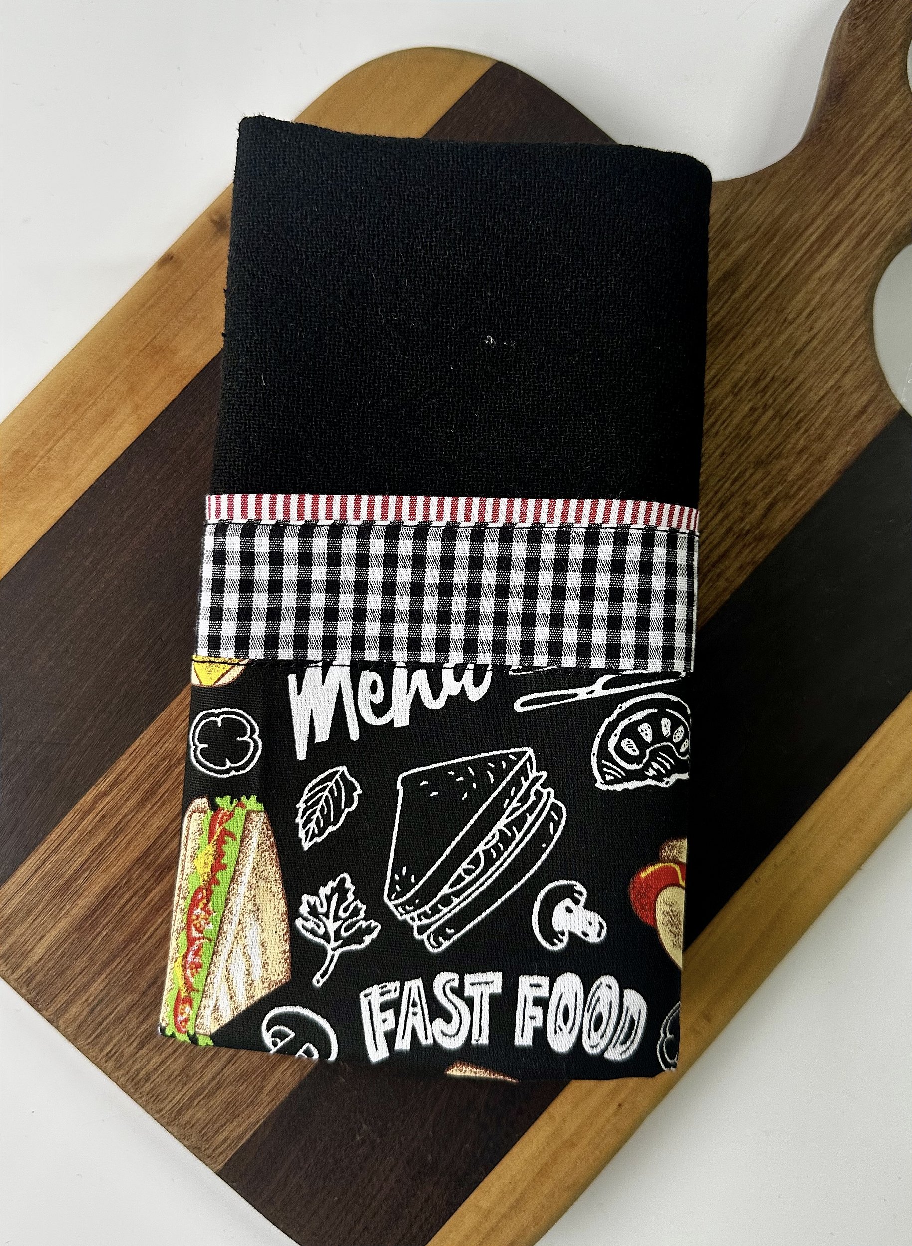 Pano de prato PRETO com barrado em tricoline. Ideal para churrasqueira e área gourmet.