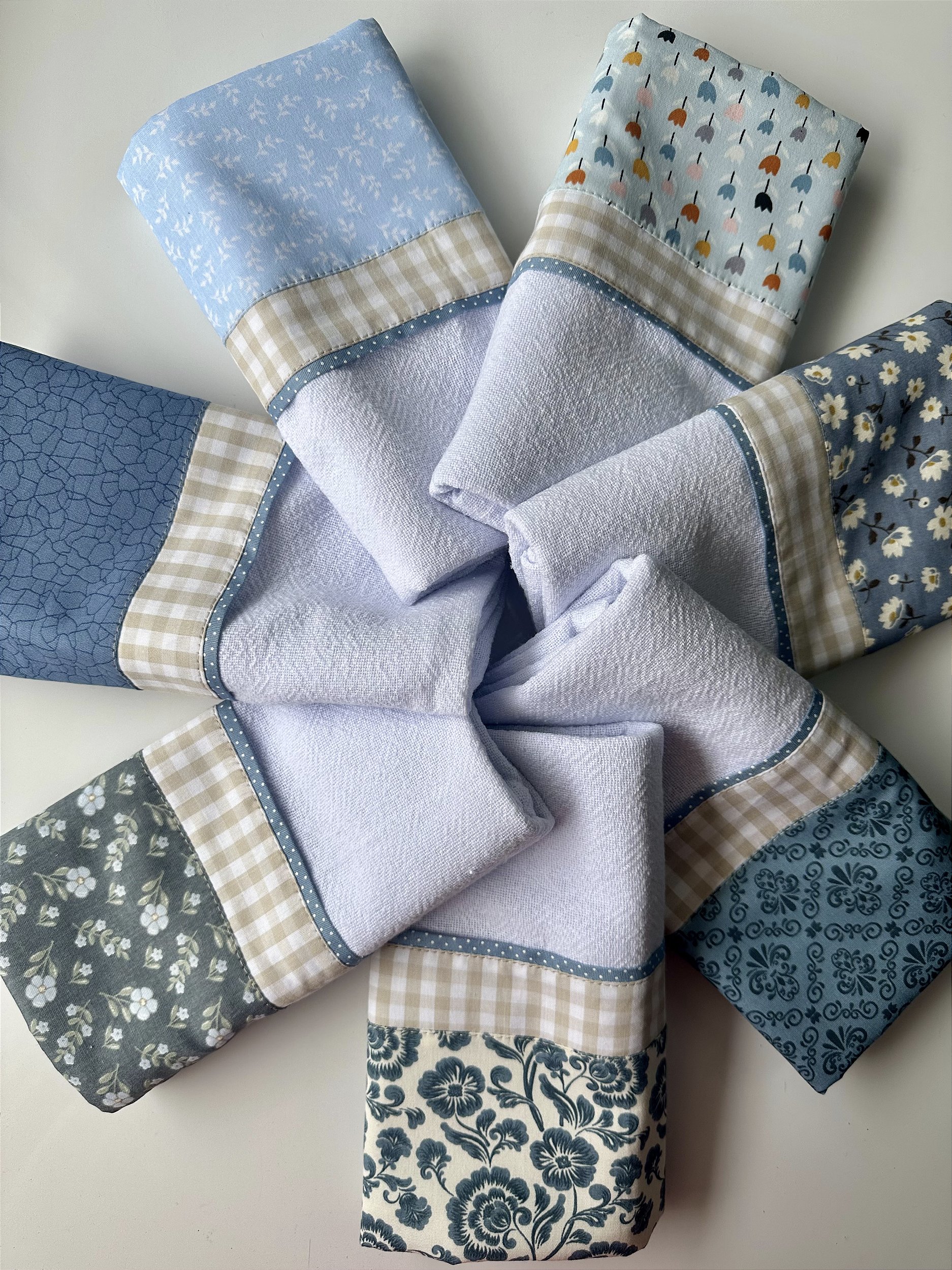 Conjunto com 7 panos de prato com barrado triplo em tricoline. Estampas variadas.