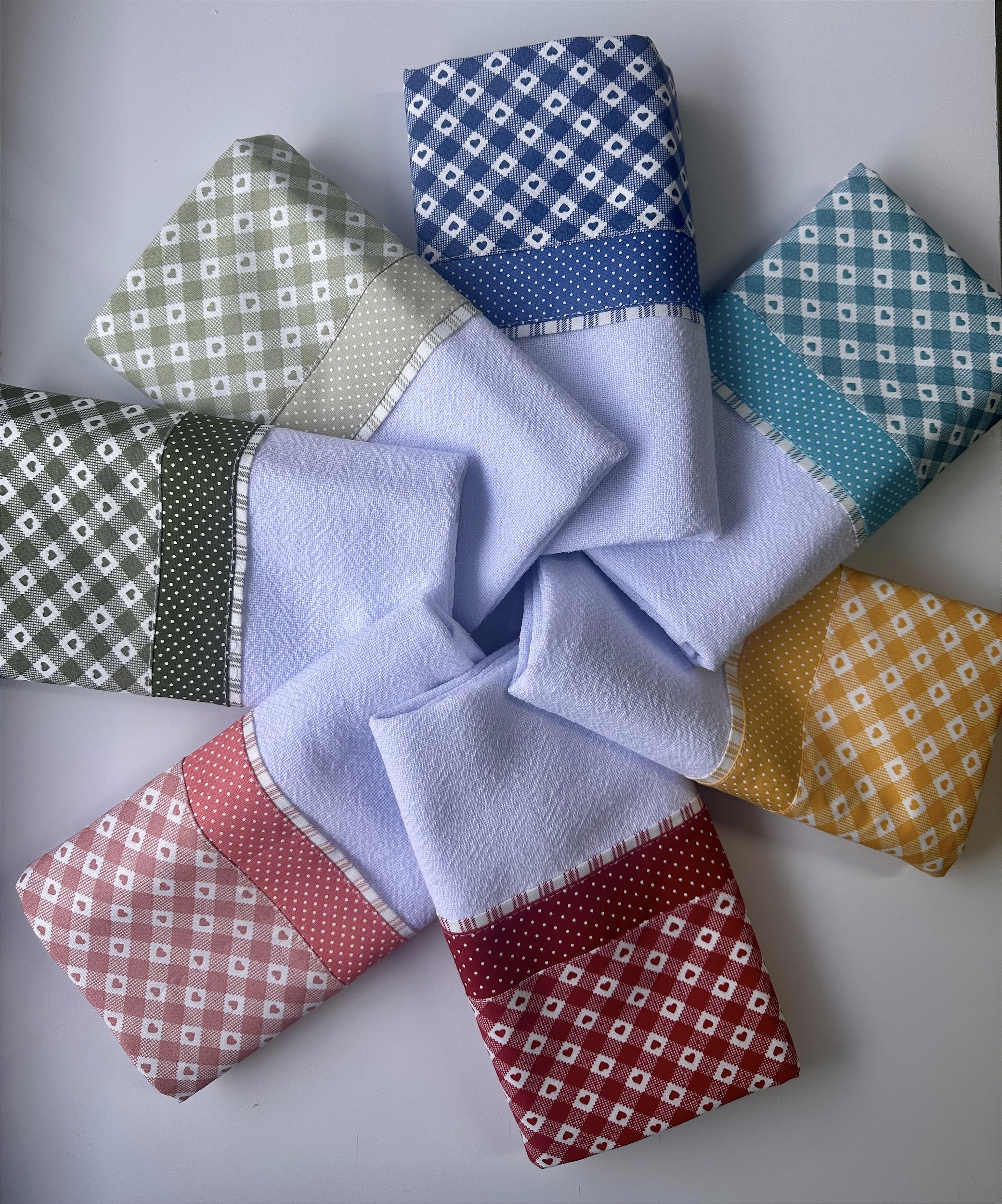 Conjunto com 7 panos de prato com barrado triplo em tricoline. Estampas variadas.